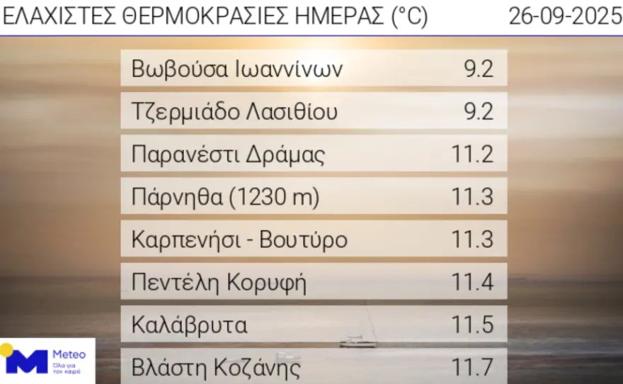 Χαμηλές θερμοκρασίες σημειώθηκαν τις πρωινές ώρες της Παρασκευής 26/09, με τη χαμηλότερη ελάχιστη θερμοκρασία να καταγράφεται στη Βωβούσα Ιωαννίνων και στο Τζερμιάδο Λασιθίου με 9,2 °C. Σύμφωνα με το δίκτυο αυτόματων μετεωρολογικών σταθμών του Εθνικού Αστεροσκοπείου Αθηνών / meteo.gr οι οκτώ χαμηλότερες ελάχιστες θερμοκρασίες τις πρωινές ώρες της Παρασκευής 26/09, παρουσιάζονται στον παρακάτω πίνακα.