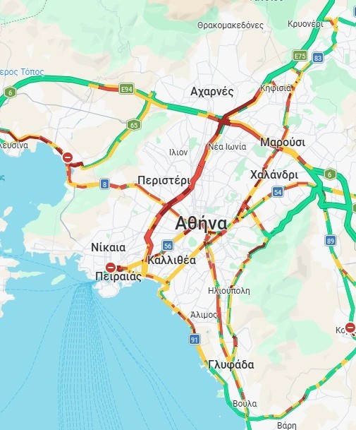 Ο Κηφισός βρίσκεται στο «κόκκινο» από το Μοσχάτο έως την Μεταμόρφωση, ενώ σημαντικές καθυστερήσεις παρατηρούνται και σε άλλες οδικές αρτηρίες.