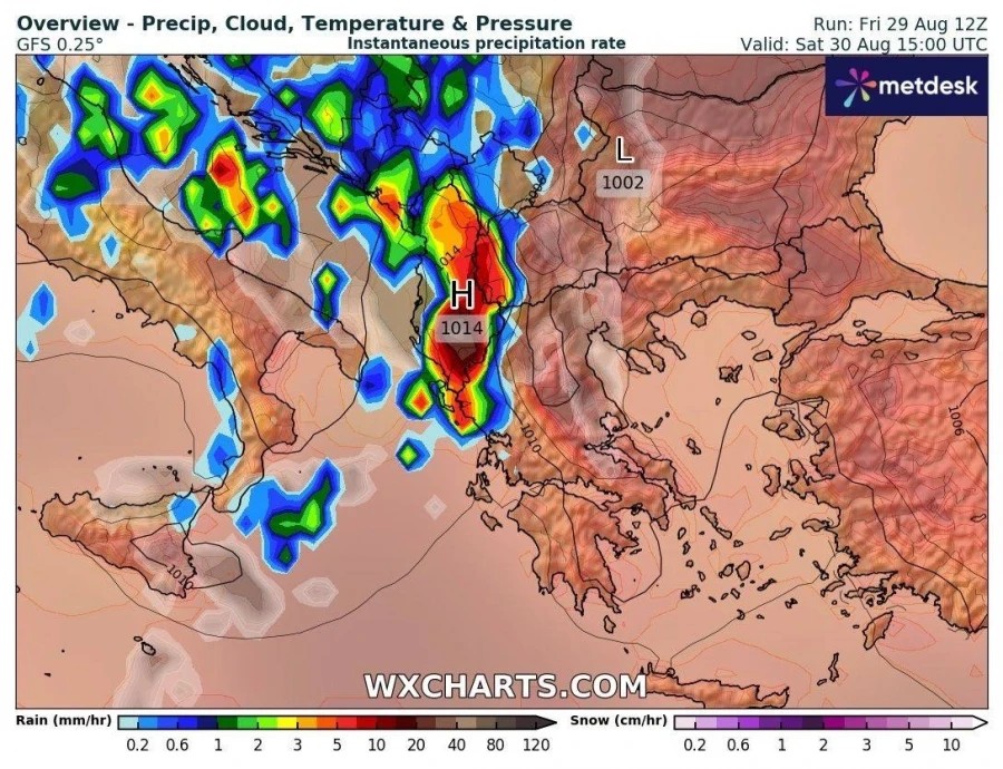 Πιο αναλυτικά, το Σάββατο 30/08 σε ολόκληρη τη χώρα αναμένονται λίγες νεφώσεις οι οποίες προοδευτικά και από τα δυτικά θα αυξηθούν. Από τις μεσημεριανές ώρες βροχές και σποραδικές καταιγίδες θα εκδηλωθούν κυρίως στα Βόρεια Επτάνησα, στην Ήπειρο και στη Δυτική Μακεδονία. Τα φαινόμενα σε αυτές τις περιοχές θα είναι έντονα και θα συνοδεύονται κατά τόπους από χαλαζοπτώσεις, ενώ τη νύχτα προς Κυριακή 31/08 θα επεκταθούν (με μικρότερη ένταση) στα Κεντρικά Επτάνησα και σε περιοχές της Δυτικής Στερεάς και της Κεντρικής-Ανατολικής Μακεδονίας.