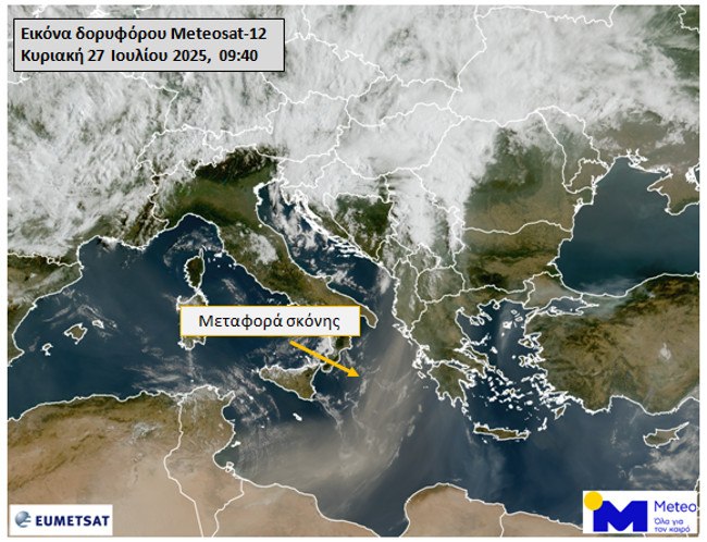 Παράλληλα με τις πολύ υψηλές θερμοκρασίες που επικρατούν στη χώρα, η ατμοσφαιρική κυκλοφορία ευνοεί τη μεταφορά μεγάλων ποσοτήτων αφρικανικής σκόνης προς την Κεντρική Μεσόγειο.