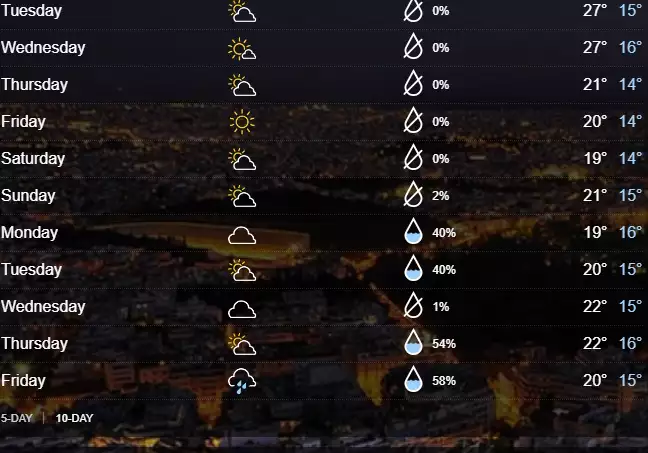 Η θερμοκρασία θα αρχίσει να πέφτει από την Τετάρτη, ωστόσο την Πέμπτη θα παρουσιάσει αισθητή πτώση με τη θερμοκρασία να πέφτει έξι βαθμούς Κελσίου. Ωστόσο, ο καιρός θα είναι ελαφρώς συννεφιασμένος, καθώς η πτώση της θερμοκρασίας δεν θα συνοδεύεται από βροχές, τουλάχιστον μέχρι την επόμενη εβδομάδα.