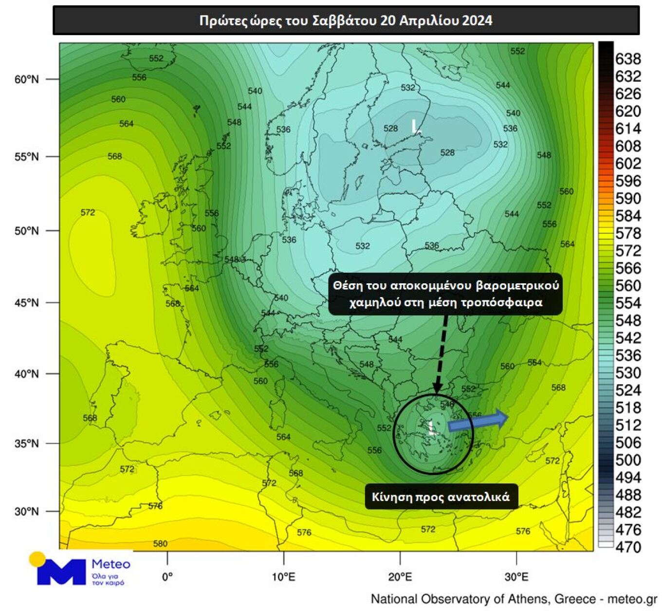 Στον χάρτη που ακολουθεί, παρουσιάζεται η θέση του αποκομμένου βαρομετρικού χαμηλού στη μέση τροπόσφαιρα τις πρώτες ώρες του Σαββάτου 20 Απριλίου.