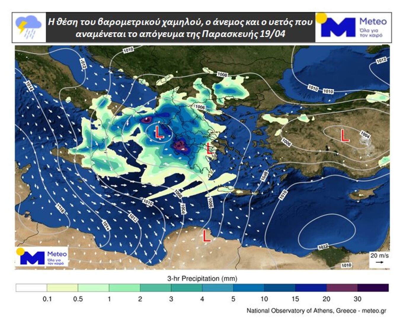 Την Παρασκευή 19/4 αναμένονται μεγάλα ύψη βροχής στη δυτική και βόρεια Ελλάδα, λίγα χιόνια σε μεγάλα υψόμετρα (1400 m) και πτώση της θερμοκρασίας.