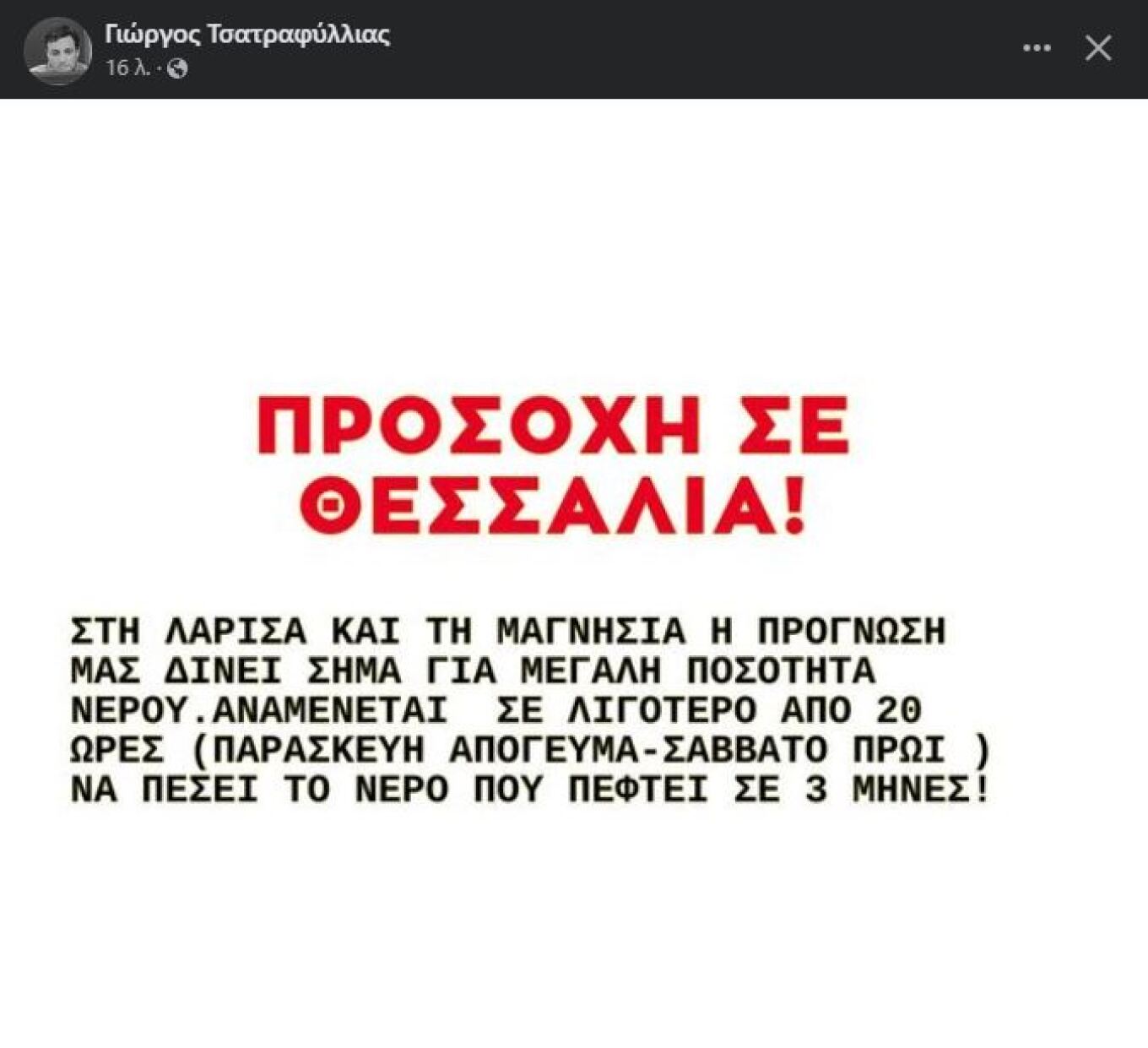 Σε ανάρτησή του ο Γιώργος Τσατραφύλλιας εφιστά την προσοχή για τη Θεσσαλία και συγκεκριμένα, για Λάρισα και Μαγνησία όπου σε λιγότερο από 20 ώρες να πέσει το νερό που πέφτει σε τρεις μήνες. «Προσοχή σε Θεσσαλία. Στη Λάρισα και τη Μαγνησία η πρόγνωση μας δίνει σήμα για μεγάλη ποσότητα νερού. Αναμένεται σε λιγότερο από 20 ώρες να πέσει το νερό που πέφτει σε 3 μήνες!» γράφει χαρακτηριστικά.