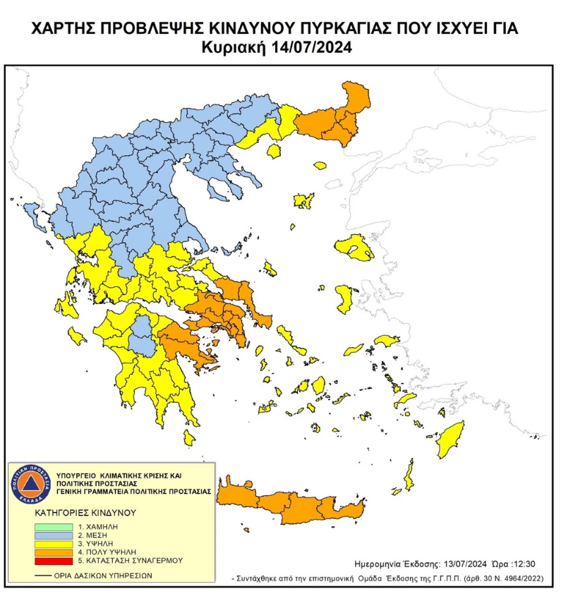 Για σήμερα, Κυριακή 14/7, προβλέπεται πολύ υψηλός κίνδυνος πυρκαγιάς (κατηγορία κινδύνου 4) σε διάφορες περιοχές, όπως η περιφέρεια Αττικής, Κρήτης, καθώς και οι περιφερειακές ενότητες Κορινθίας, Αργολίδας, Βοιωτίας, Εύβοιας, Έβρου και Ροδόπης. Αυτό προκύπτει από τον Χάρτη Πρόβλεψης Κινδύνου Πυρκαγιάς που εκδίδει η γενική γραμματεία Πολιτικής Προστασίας του υπουργείου Κλιματικής Κρίσης και Πολιτικής Προστασίας.