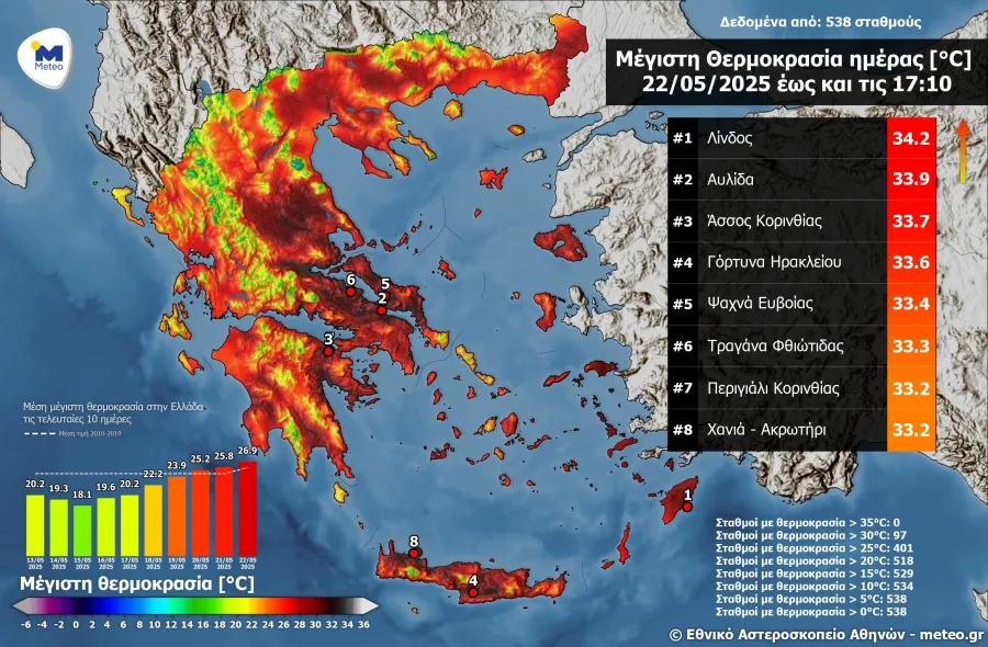 Η θερμοκρασία έφτασε και ξεπέρασε τους 30°C σε μεγάλο μέρος της χώρας την Πέμπτη 22 Μαΐου 2025, επιβεβαιώνοντας τη διατήρηση ενός ιδιότυπου μίνι καλοκαιριού, κυρίως στην ανατολική και νότια επικράτεια. Σύμφωνα με τα δεδομένα του Εθνικού Αστεροσκοπείου Αθηνών / meteo.gr, 97 σταθμοί κατέγραψαν θερμοκρασίες άνω των 30°C, με την υψηλότερη μέγιστη να σημειώνεται στη Λίνδο της Ρόδου, όπου ο υδράργυρος έφτασε τους 34,2°C. Ωστόσο, οι ήπιες συνθήκες φαίνεται να αποτελούν παρελθόν, καθώς το νέο κύμα κακοκαιρίας προετοιμάζει την άφιξή του, με τον προγνώστη Θεοφάνη Χατζηγρίβα να προειδοποιεί για ισχυρά καιρικά φαινόμενα από την Κυριακή.