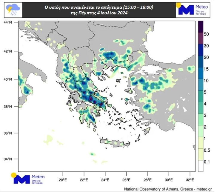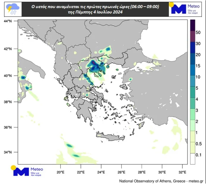 Στον χάρτη που ακολουθεί παρουσιάζεται ενδεικτικά ο υετός που αναμένεται τις πρώτες πρωινές ώρες και το απόγευμα της Πέμπτης 04/07.