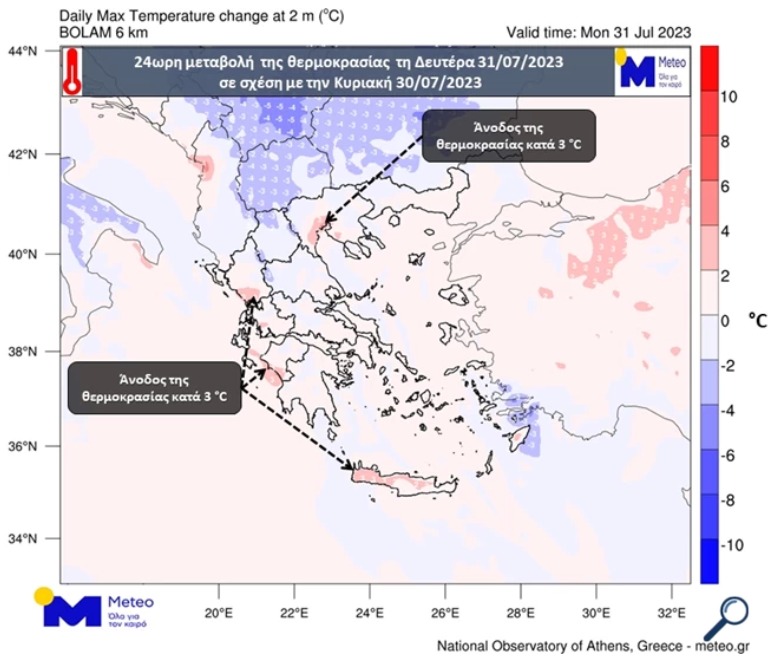 Σύμφωνα με τα τελευταία προγνωστικά στοιχεία του Εθνικού Αστεροσκοπείου Αθηνών / meteo.gr, οι μέγιστες τιμές της θερμοκρασίας τις μεσημεριανές ώρες της Δευτέρας 31/07 προβλέπεται να παρουσιάσουν άνοδο έως και 3 °C κυρίως στη Δυτική Ελλάδα και στην Κρήτη, σε σχέση με τις αντίστοιχες τιμές της Κυριακής 30/07/2023.