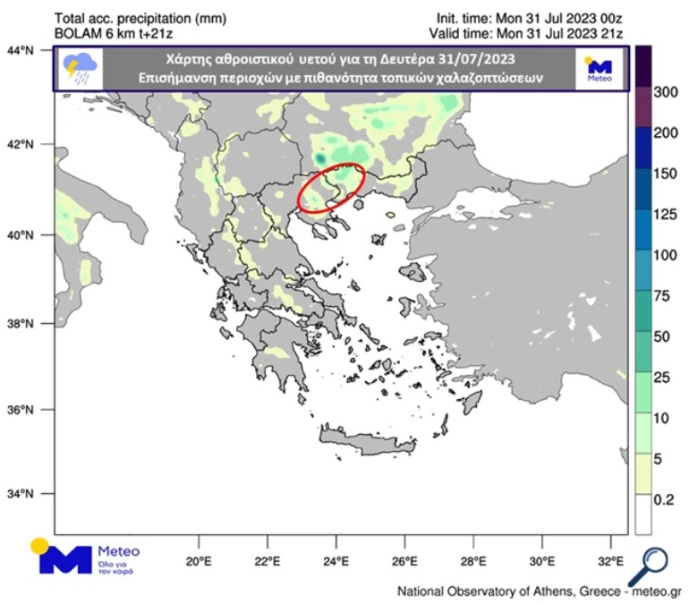 Παράλληλα, τοπικοί όμβροι ή καταιγίδες κυρίως τις μεσημεριανές κι απογευματινές ώρες της Δευτέρας 31/07 προβλέπονται στη Μακεδονία, στη Θράκη και στα ορεινά τμήματα της Ηπείρου, της Θεσσαλίας, της Κεντρικής Στερεάς και της Πελοποννήσου. Μικρή πιθανότητα τοπικών χαλαζοπτώσεων υπάρχει στη Μακεδονία. Στον παρακάτω προγνωστικό Χάρτη 2, εμφανίζονται τα εκτιμώμενα συνολικά ύψη βροχόπτωσης σε χιλιοστά (mm) κατά τη διάρκεια της Δευτέρας 31/07/2023, όπως υπολογίστηκαν από αριθμητικό μοντέλο πρόγνωσης καιρού του Εθνικού Αστεροσκοπείου Αθηνών / meteo.gr, ενώ επισημαίνεται η περιοχή με τη πιθανότητα τοπικών χαλαζοπτώσεων.