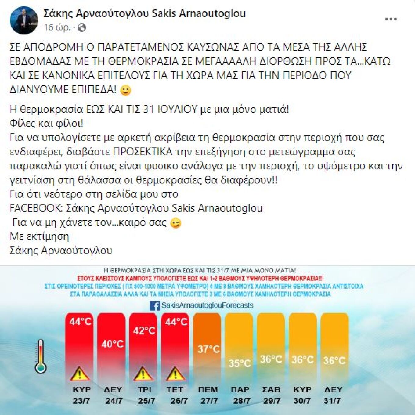 Ενώ προχώρησε και σε νέα ανάρτηση σήμερα το μεσημέρι, και όπως αναφέρει «Ορατό μεν είναι επιτέλους το τέλος του καύσωνα, με την ερχόμενη όμως Τετάρτη, 26 Ιουλιόυ να αποτελεί κατα την ταπεινή μου άποψη, την τελευταία αλλά και την πιο επικίνδυνη καιρικά μέρα από πλευράς καύσωνα και λιβα μέχρι σήμερα!»