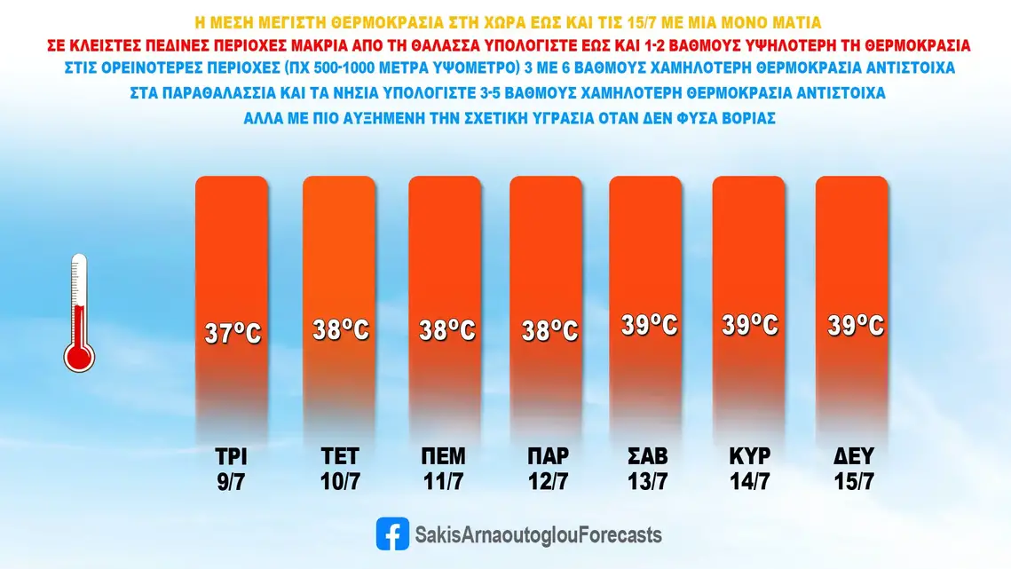 Επιπλέον, και ο Σάκης Αρναούτογλου, μέσω μιας ανάρτησής του στα κοινωνικά δίκτυα, προειδοποίησε για τις υψηλές θερμοκρασίες που αναμένεται να σημειωθούν στη χώρα μας μέχρι τις 15 Ιουλίου. Ο μετεωρολόγος γνωστοποίησε ότι η έντονη ζέστη θα διαρκέσει για αρκετές ημέρες, δημιουργώντας συνθήκες που απαιτούν προσοχή από τους πολίτες. Οι προβλέψεις του υποδεικνύουν ότι οι θερμοκρασίες θα παραμείνουν σε υψηλά επίπεδα, ενδεχομένως επηρεάζοντας σημαντικά την καθημερινότητα και τις δραστηριότητες των κατοίκων.