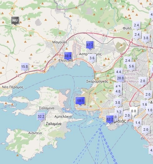 Στη Σαλαμίνα τα φαινόμενα σημειώθηκαν μέσα σε ένα μικρό χρονικό διάστημα, με τη ραγδαιότητα να ξεπερνά τα 100 χιλιοστά/ώρα.