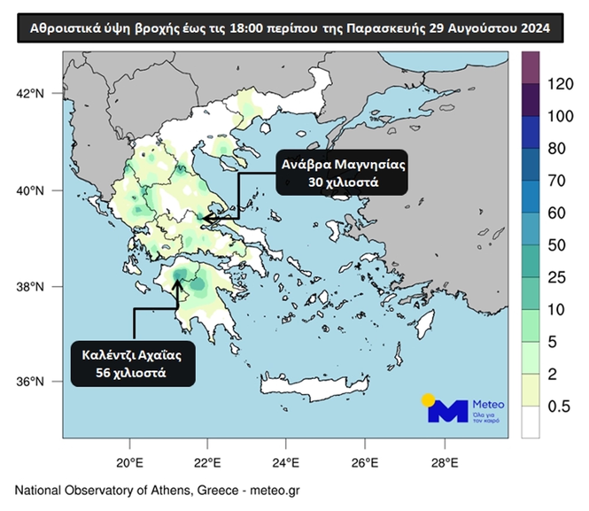 Προληπτικά μέτρα λαμβάνονται σε όλη τη χώρα, με τη διακοπή της κυκλοφορίας στην Παλαιά Εθνική Οδό Κορίνθου–Πατρών, στο σημείο του Αιγίου, όπου στο παρελθόν έχουν σημειωθεί κατολισθήσεις. Σύμφωνα με τις μετρήσεις του meteo.gr και του Εθνικού Αστεροσκοπείου Αθηνών, το μεγαλύτερο αθροιστικό ύψος βροχόπτωσης σημειώθηκε στο Καλέντζι Αχαΐας, φτάνοντας τα 56 χιλιοστά μέχρι τις 18:00 της Πέμπτης. Ενδεικτικό της έντασης των φαινομένων είναι το γεγονός ότι 38,4 χιλιοστά καταγράφηκαν μέσα σε μόλις 30 λεπτά.