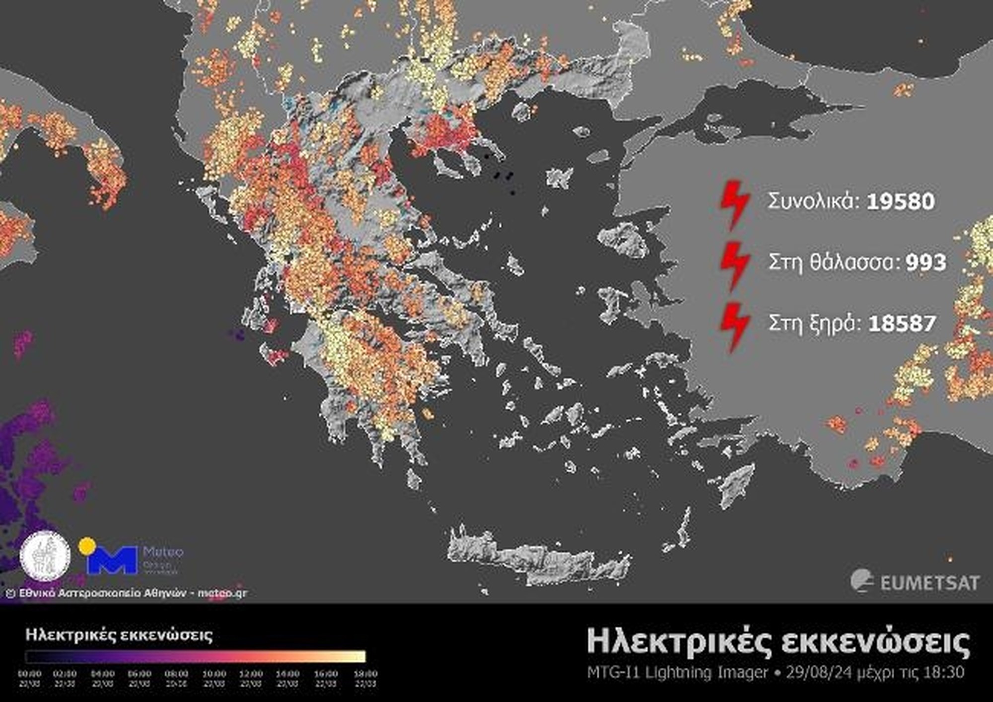 Η ηλεκτρική δραστηριότητα στην ατμόσφαιρα ήταν επίσης έντονη, με τον δορυφόρο MTG-I1 να καταγράφει 19.580 ηλεκτρικές εκκενώσεις, εκ των οποίων οι 18.587 σημειώθηκαν πάνω από τη ξηρά και οι υπόλοιπες 933 πάνω από τη θάλασσα.