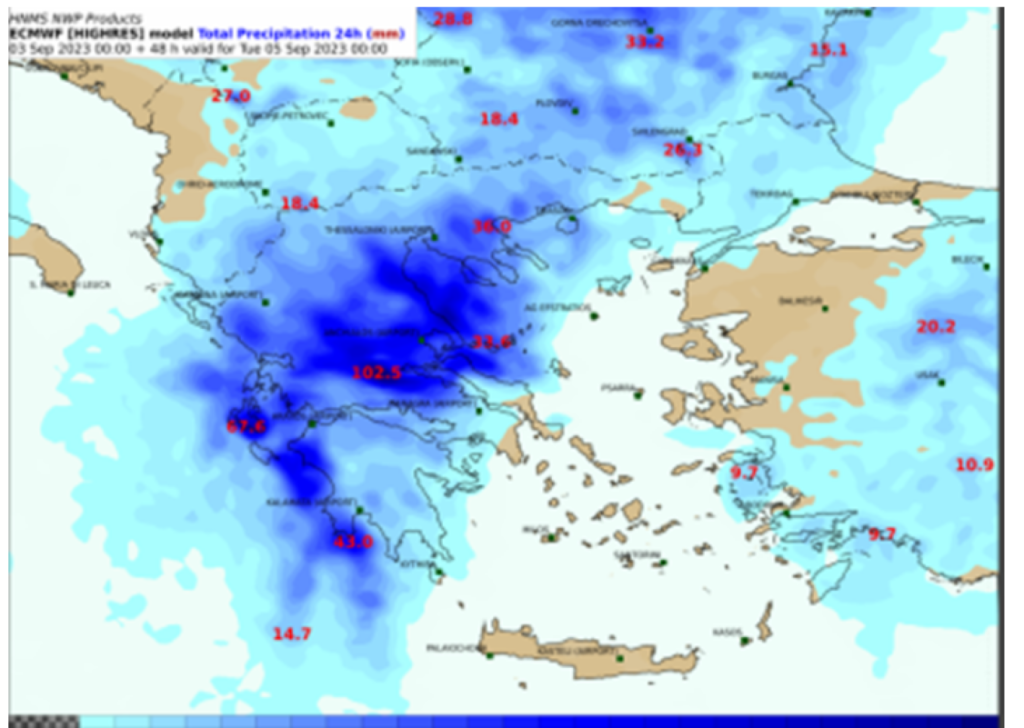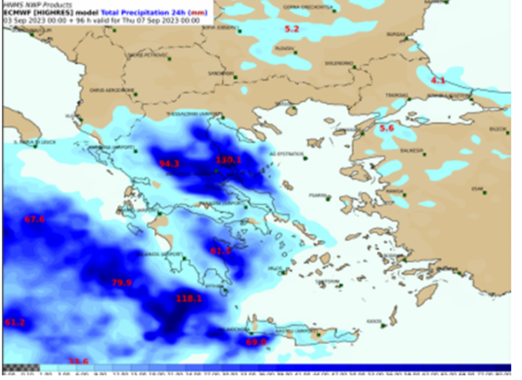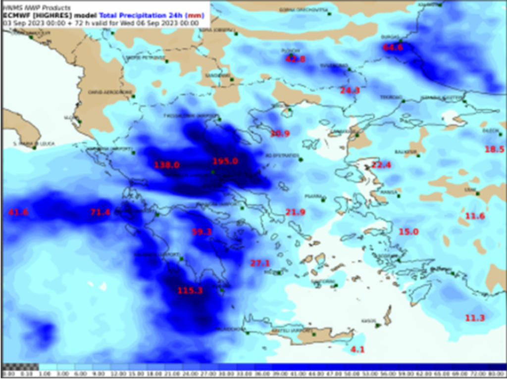 Χαρακτηριστικά, στους προαναφερθέντες νομούς αναμένεται να πέσουν πάνω από 500 τόνοι νερού ανά στρέμμα, το τριήμερο 4 με 7 Σεπτεμβρίου, από σήμερα δηλαδή μέχρι και την Πέμπτη.