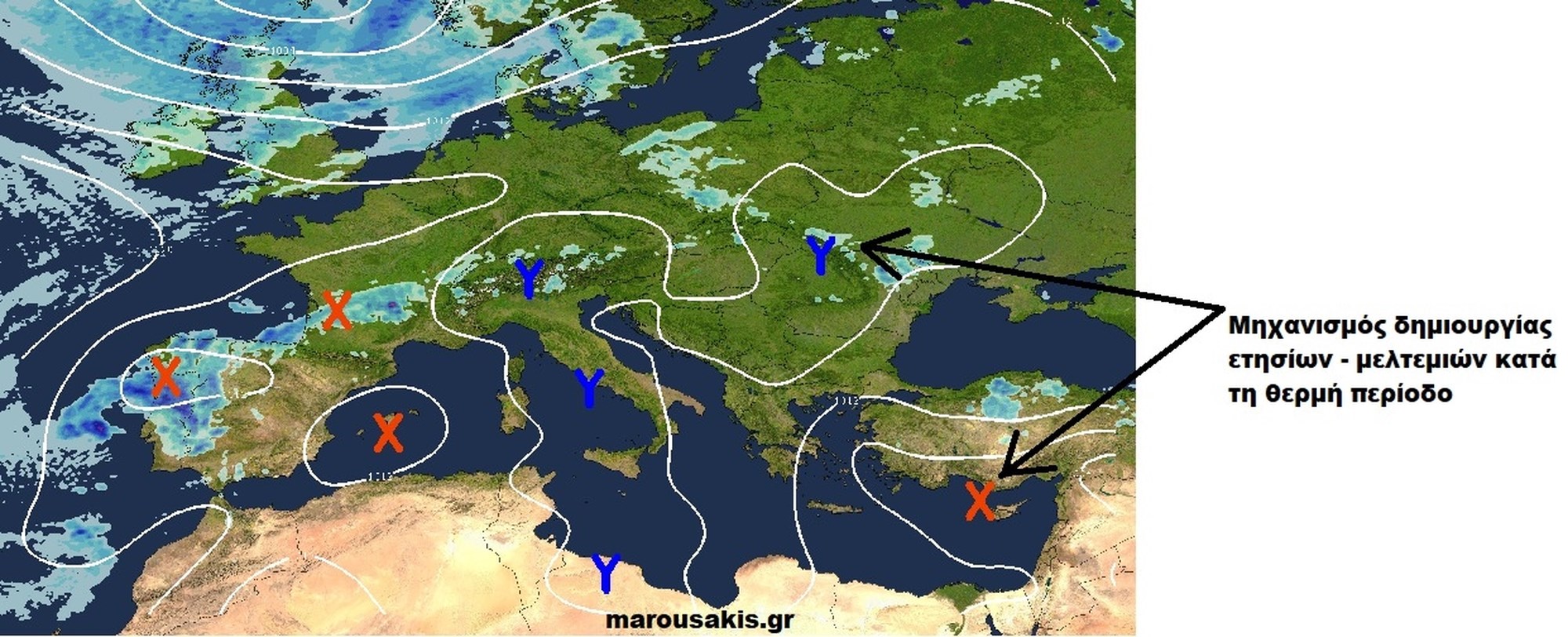 Στον παρακάτω χάρτη αποτυπώνεται ο μηχανισμός δημιουργίας των ετησίων με τις χαμηλές πιέσεις προς την Κύπρο και τις πιο υψηλές βορειότερα.