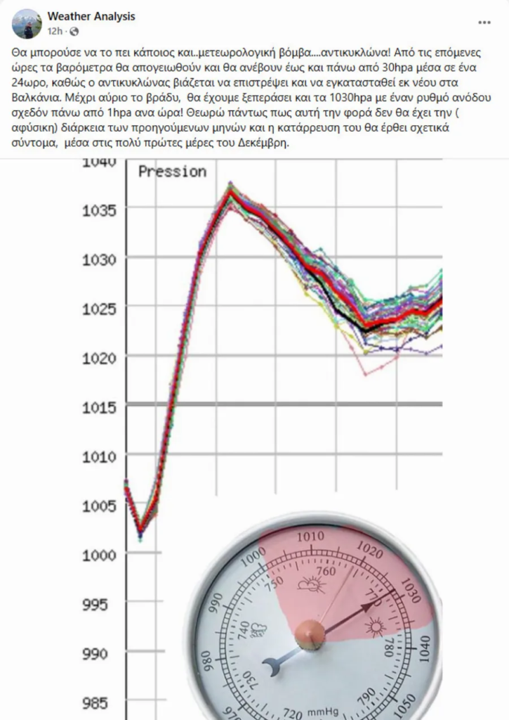 «Θα μπορούσε να το πει κάποιος και… μετεωρολογική βόμβα… αντικυκλώνα! Από τις επόμενες ώρες τα βαρόμετρα θα απογειωθούν και θα ανέβουν έως και πάνω από 30hpa μέσα σε ένα 24ωρο, καθώς ο αντικυκλώνας βιάζεται να επιστρέψει και να εγκατασταθεί εκ νέου στα Βαλκάνια.