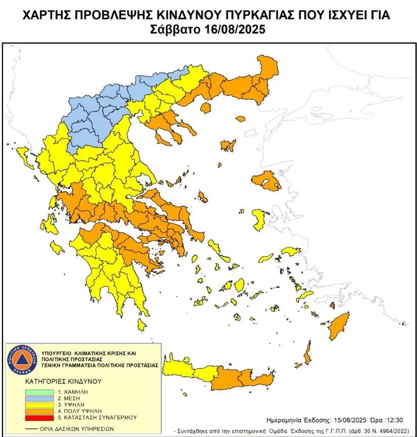 Πολύ υψηλός κίνδυνος πυρκαγιάς (κατηγορία 4), προβλέπεται και για το Σάββατο 16 Αυγούστου, σύμφωνα με τον Χάρτη Πρόβλεψης Κινδύνου Πυρκαγιάς που εκδίδει η γενική γραμματεία Πολιτικής Προστασίας, για τις εξής περιοχές: