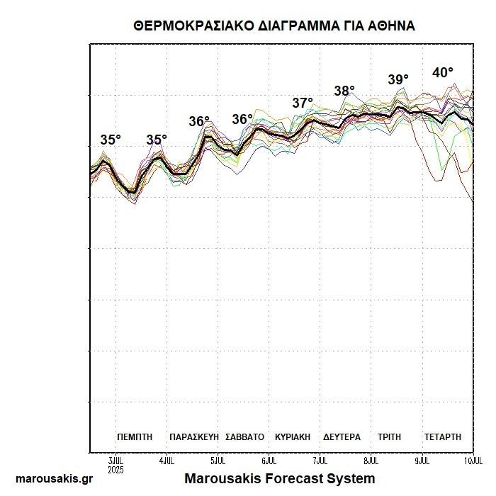 Στην τελευταία μας κάρτα παρουσιάζουμε διάγραμμα από το προγνωστικό μας σύστημα για την πορεία της μέγιστης θερμοκρασίας για το κέντρο της Αθήνας.