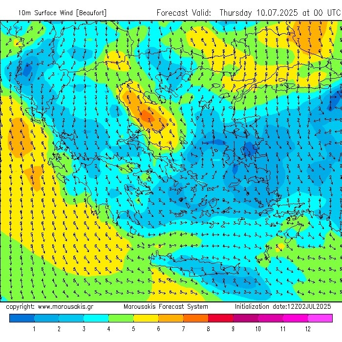 Στον τρίτο χάρτη μας αποτυπώνονται οι διευθύνσεις και οι εντάσεις των ανέμων καθώς θα προχωράμε χρονικά μέσα στην Πέμπτη.