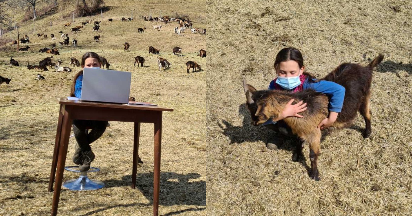 Η ιστορία του 10χρονου κοριτσιού συγκινεί. Εξαιτίας της πανδημίας του κορωνοϊού, τα σχολεία είναι κλειστά στην κόκκινη ζώνη και η μικρή κάνει μάθημα κυριολεκτικά ανάμεσα στις κατσίκες. Η μαμά της είναι υγειονομικός και δεν μπορεί να την πάρει μαζί της στη δουλειά.