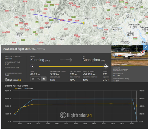 The flight is China Eastern Airlines MU5735, from Kunming to Guangzhou. According to Flightradar24, the speed and altitude dropped sharply near Wuzhou. Boeing 737-800ng passenger aircraft, registration number B1791, 6.8 years old.🙏🏻🙏🏻🙏🏻 pic.twitter.com/wOwBC25KuW