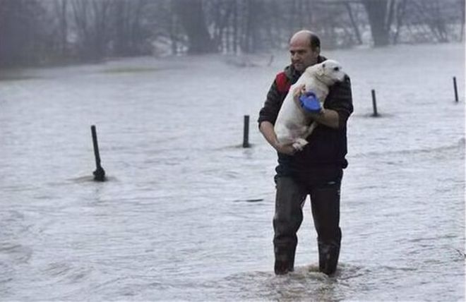 Ο σκύλος δεν μπορούσε να περπατήσει λόγω της πλημμύρας οπότε η αγκαλιά ήταν αναπόφευκτη