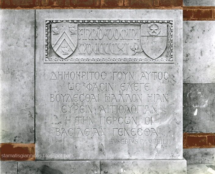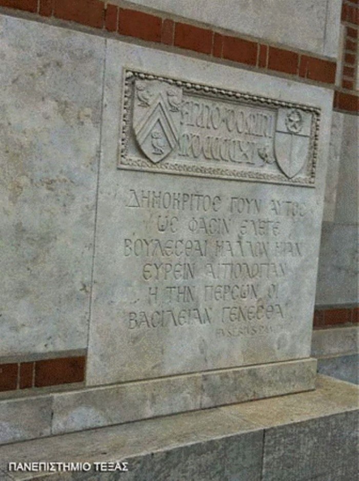 2. Στο πανεπιστήμιο του Τέξας υπάρχει ένα από τα σημαντικότερα αποφθέγματα του Δημόκριτου : »…. βούλεσθαι μᾶλλον μίαν εὑρεῖν αἰτιολογίαν ἢ τὴν Περσῶν οἱ βασιλείαν γενέσθαι…», (προτιμούσε να βρει μία ερμηνεία »για ένα φαινόμενο», παρά να γίνει δικό του το βασίλειο της Περσίας).