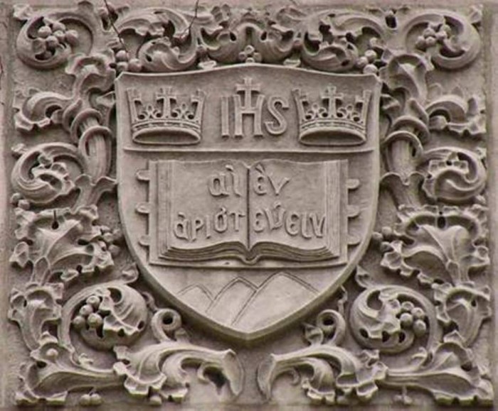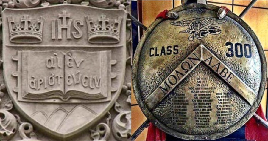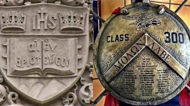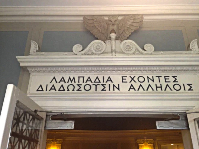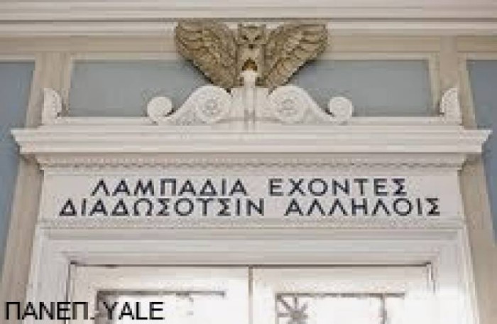 10. Πανεπιστήμιο «Yale» στις ΗΠΑ. Φράση από την «Πολιτεία» του Πλάτωνος: «Λαμπάδια ἔχοντες διαδώσουσιν ἀλλήλοις» (Οι φέροντες τις δάδες τις μεταλαμπαδεύουν ο ένας στον άλλον).