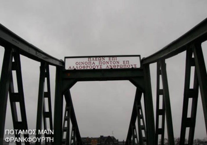 9. Επιγραφή στην γέφυρα «Eiserner Steg» της Φρανκφούρτης, Γερμανία. «ΠΛΕΩΝ ΕΠΙ ΟΙΝΟΠΑ ΠΟΝΤΟΝ ΕΠ’ ΑΛΛΟΘΡΟΟΥΣ ΑΝΘΡΩΠΟΥΣ». «Ταξιδεύοντας σε ξένες θάλασσες με ανθρώπους που μιλούν άλλες γλώσσες».
