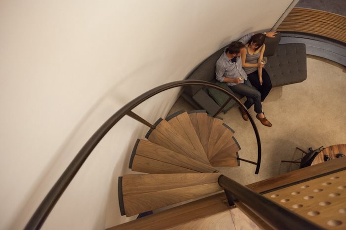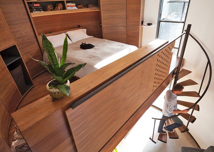 Η ελικοειδής σκάλα οδηγεί σε ένα υπνοδωμάτιο. Αυτό, λούζεται από άπλετο φυσικό φως, λόγω ενός φεγγίτη, που βρίσκεται στην οροφή.