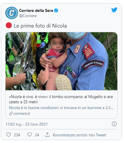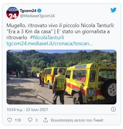 Όπως είχε γίνει γνωστό το παιδί είχε εξαφανιστεί από το σπίτι του σε ορεινή περιοχή της Τοσκάνης πριν από δυο ημέρες. Η υγεία του παιδιού είναι σε καλή κατάσταση, το μόνο πρόβλημα που εντόπισαν οι γιατροί είναι μια ελαφρά αφυδάτωση.