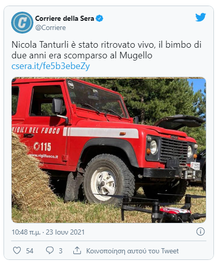 Εντοπίστηκε το παιδί δυο ετών που είχε εξαφανιστεί το βράδυ της Δευτέρας (21/06) από το σπίτι του, σε μια ορεινή περιοχή της Τοσκάνης στην Ιταλία, και έτσι έληξε ο συναγερμός.