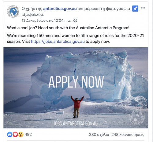 Η Αυστραλία αναζητά 150 εργάτες, τεχνικούς και επιστήμονες για να επανδρώσει ερευνητικούς σταθμούς στην Ανταρκτική με το αζημίωτο, για την σεζόν 2020-2021.