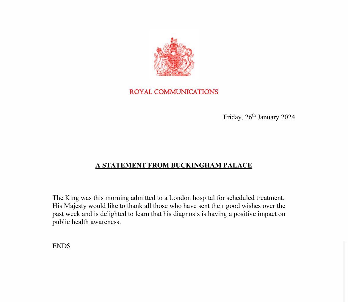 «Ο Βασιλιάς εισήχθη σήμερα το πρωί σε κλινική του Λονδίνου για προγραμματισμένη επέμβαση. Η Αυτού Μεγαλειότητα θέλει να ευχαριστήσει όλους όσους του έστειλαν ευχές τις περασμένες εβδομάδες ενώ είναι ικανοποιημένος που η διάγνωση του προβλήματός του είχε θετικό αντίκτυπο σε ζητήματα πρόληψης αναφορικά με την υγεία.»