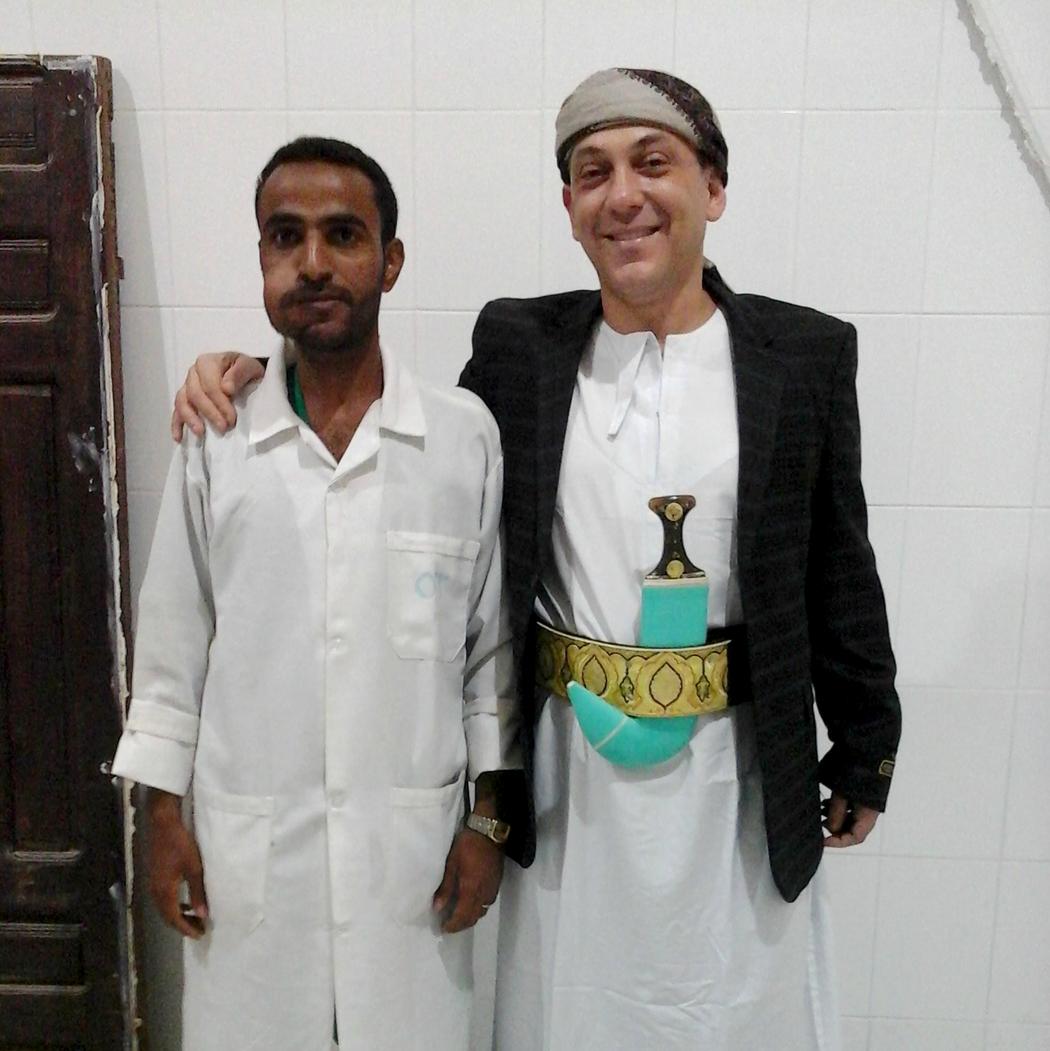 Ο Δημήτρης με έναν από τους ασθενείς του στην Υεμένη. Πριν αποχωρήσει, οι ντόπιοι τού χάρισαν μία στολή πολεμιστή, για να τον τιμήσουν που τους βοήθησε και κινδύνεψε μαζί τους.
