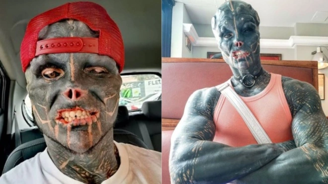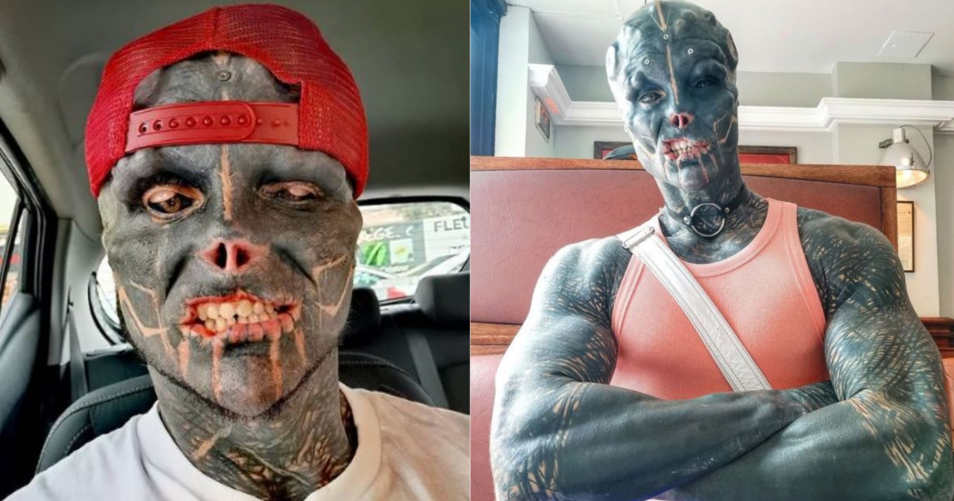 Ο 33χρονος “εξωγήινος” έχει καλύψει το μεγαλύτερο μέρος του σώματός του με σκούρα τατουάζ-συμπεριλαμβανομένων των βολβών των ματιών του, έχει τοποθετήσει εμφυτεύματα κάτω από το δέρμα στο κεφάλι και τα χέρια του, έχει ακρωτηριάσει δύο δάχτυλα, ένα μέρος της μύτης του και τα δύο αυτιά του.