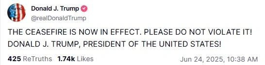 Σε ισχύ τέθηκε από το πρωί της Τρίτης η εκεχειρία μεταξύ Ιράν και Ισραήλ, με πρωτοβουλία του Ντόναλντ Τραμπ, ο οποίος έστειλε αυστηρό μήνυμα μέσω του Truth Social.