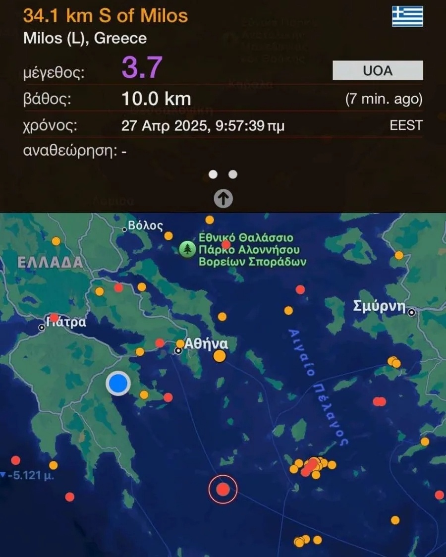 Πρόκειται για σεισμό της τάξεως των 3,7 βαθμών της κλίμακας Ρίχτερ 34,1 χλμ από τη Μήλο στις 9:57 το πρωί, με εστιακό βάθος 10 χλμ.