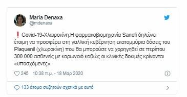 «Ασθενείς στους οποίους χορηγήθηκαν 600mg ημερησίως χλωροκίνης θεραπεύτηκαν σε 6 μέρες και δεν ήταν πια φορείς του ιού. Η κλινική δοκιμή έγινε σε νοσοκομείο της Μασσαλίας όπου τώρα νοσηλεύεται βουλευτίνα του Μακρόν στην οποία χορηγείται η πειραματική θεραπεία», τόνισε η ανταποκρίτρια του Star, Μαρία Δεναξά.