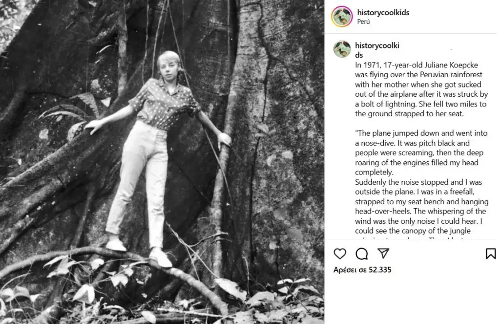 Η συγκλονιστική ιστορία της Juliane Koepcke θυμίζει πως η ανθρώπινη θέληση για επιβίωση μπορεί να ξεπεράσει κάθε λογική. Σε ηλικία μόλις 17 ετών, κατάφερε να σωθεί από ένα αεροπορικό δυστύχημα που σκότωσε 91 ανθρώπους, και να επιβιώσει μόνη της στη ζούγκλα του Αμαζονίου για δέκα ημέρες.