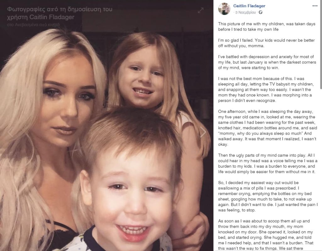 «Αυτή η φωτογραφία με τα παιδιά μου, έχει τραβηχτεί λίγες μερες πριν την απόπειρα αυτοκτονίας μου. Είμαι τόσο χαρούμενη που η απόπειρα αυτη απέτυχε. Τα παιδιά σου δεν θα ήταν ποτέ καλύτερα χωρίς εσένα, μαμά. Παλεύω με την κατάθλιψη και το άγχος για το μεγαλύτερο μέρος της ζωής μου, αλλά τον περασμένο Ιανουάριο οι πιο σκοτεινές γωνιές του μυαλού μου, άρχιζαν να κερδίζουν.
