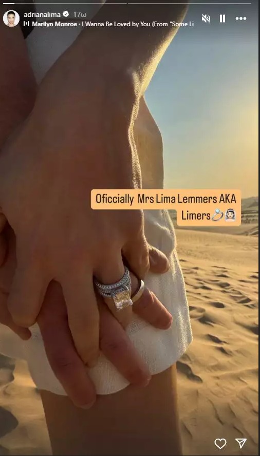 Το ζευγάρι βρέθηκε στην έρημο όπου μοιράστηκε ένα τρυφερό στιγμιότυπο κρατώντας τα σφιχτά τα χέρια του αποκαλύπτοντας έτσι τη βέρα το εντυπωσιακό μονόπτερο: «Επίσημα κυρία Λίμα Λέμερς ή Λίμερς», έγραψε στην ανάρτησή της η Αντριάνα Λίμα.