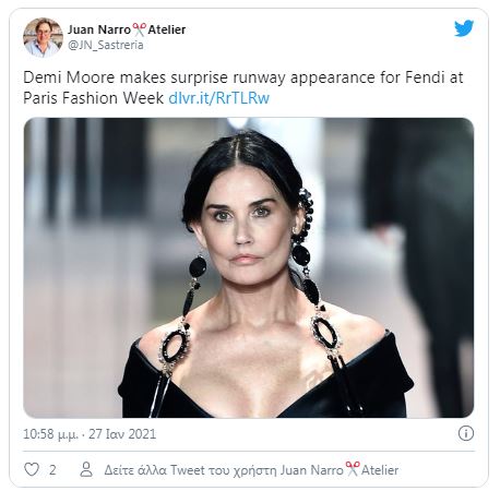 Ντέμι Μουρ: Η 58χρονη ηθοποιός έγινε θέμα συζήτησης. Αυτό, διότι οι καλεσμένοι στο ντεφιλέ του οίκου Fendi στο Παρίσι τρόμαξαν να τη γνωρίσουν. Διάσημα μοντέλα και σταρ του Χόλιγουντ παρελαύναν, με ρούχα του ιταλικού οίκου στην πασαρέλα.