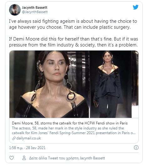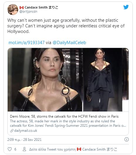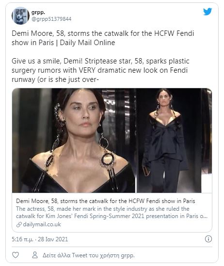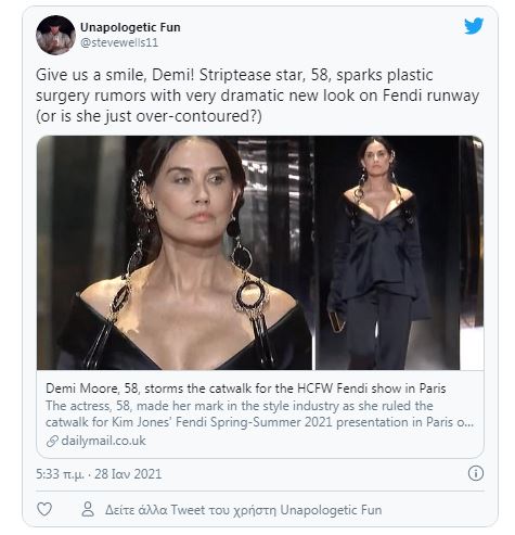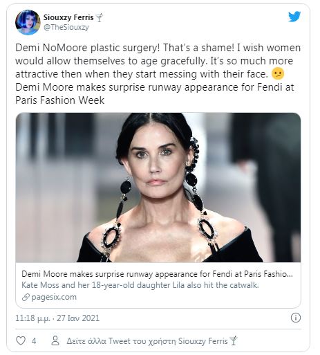 Φυσικά πάντα κάποιος βρίσκεται να ανεβάσει φωτό στα social media και πριν ακόμα η Ντέμι Μουρ προλάβει να κατέβει από την πασαρέλα σχόλια επιπέδου «η χειρότερη πλαστική όλων των εποχών», «ο πλαστικός ξέχασε να προσθέσει τα μάγουλα στο τέλος» αντηχούσαν σε όλο το twitter.