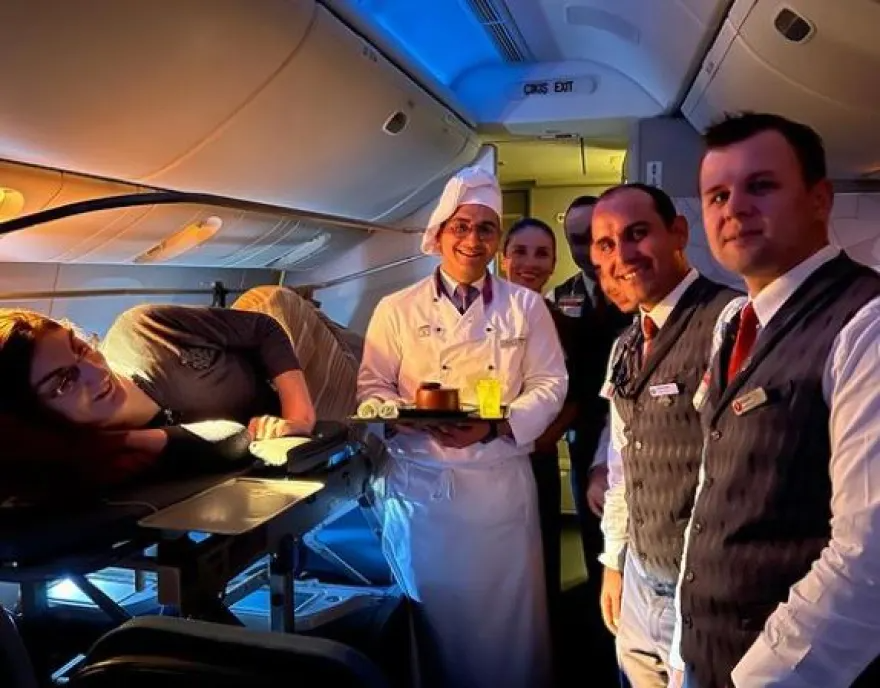 Όπως αναφέρει η Daily Mail, η 24χρονη δεν είχε ταξιδέψει ποτέ με αεροπλάνο στο παρελθόν, αλλά τον Σεπτέμβριο πέταξε στο Σαν Φρανσίσκο με αεροσκάφος της Turkish Airlines, η οποία αφαίρεσε έξι θέσεις σε ένα από τα αεροσκάφη της και τις αντικατέστησε με ένα ειδικά κατασκευασμένο φορείο, ώστε να επιτρέψει στη νεαρή γυναίκα να πετάξει με άνεση.