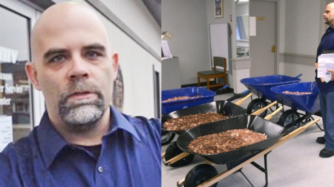 Για να τα μεταφέρει, γέμισε μάλιστα πέντε καρότσια με 300.000 κέρματα και τα μηχανήματα αυτόματης καταμέτρησης κλάταραν και βγήκαν εκτός λειτουργίας, ενώ οι υπάλληλοι τα μετρούσαν επί επτά ώρες.