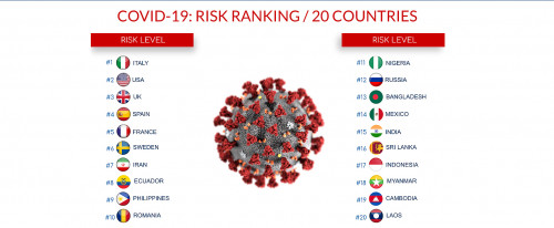 Στον αντίποδα, η Ιταλία είναι στην κορυφή της κατάταξης για τον κίνδυνο, στο πλαίσιο της οποίας ελήφθησαν υπόψη- μεταξύ άλλων- ο κίνδυνος μόλυνσης, νοσηλείας, θανάτου όπως και ο κίνδυνος για αρνητικές συνέπειες στην οικονομία, την ποιότητα ζωής και στα γεωπολιτικά ζητήματα, εξαιτίας της πανδημίας.