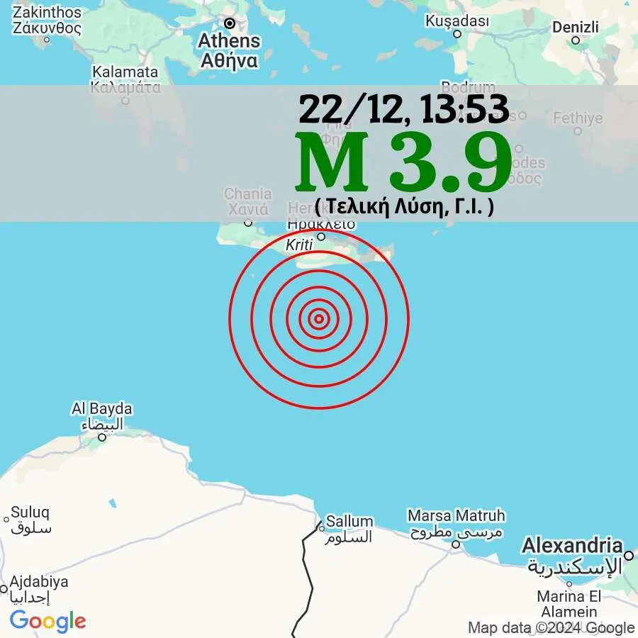 Σεισμός, μεγέθους 3,9 Ρίχτερ, σημειώθηκε στα ανοιχτά της Κρήτης, σήμερα, Κυριακή, το μεσημέρι, ενώ ακολούθησε στα Ιωάννινα, μεγέθους 3,6 Ρίχτερ.