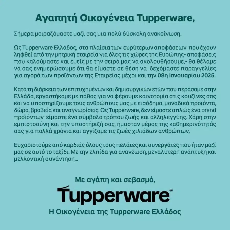 Σήμερα μοιραζόμαστε μαζί σας μία πολύ δύσκολη ανακοίνωση. Ως Tupperware Ελλάδος, στα πλαίσια των ευρύτερων αποφάσεων που έχουν ληφθεί από τη μητρική εταιρεία για όλες τις χώρες της Ευρώπης- αποφάσεις που καλούμαστε και εμείς με τη σειρά μας να ακολουθήσουμε- θα θέλαμε να σας ενημερώσουμε ότι θα είμαστε σε θέση να δεχόμαστε παραγγελίες για αγορά των προϊόντων της εταιρείας μέχρι και την 8η Ιανουαρίου 2025.